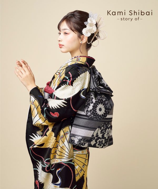 レトロな小紋柄の正絹振袖 ブラックの中に鶴や扇といった古き良き演技良い柄が全体に入っています 流行に流されないシックな着こなしをしたい人におすすめです